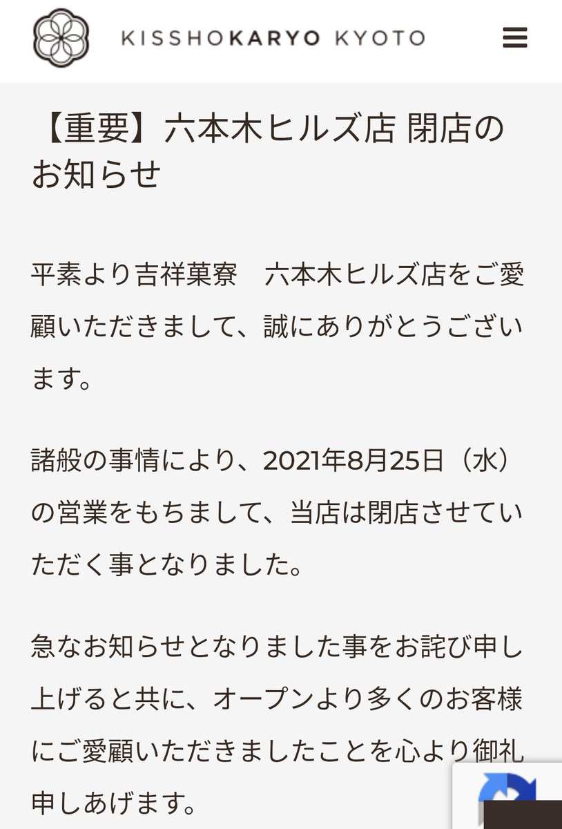 一昨日。東京・六本木の吉祥菓寮へ行こうと思っていたら…まさかの閉店?!7月行った時は天丼でお腹パンパン成ったから『9月に来るし、いっか~』何て思ってたのに…"雅"は一生食べれへんの?😭"後でヤロウはバカ野郎"とはよく言ったと痛感。後悔しないよう前から気になっていたきな粉シェイクを食す! pic.twitter.com/A4Gpqbr5LJ 2021-09-06 22:29:00